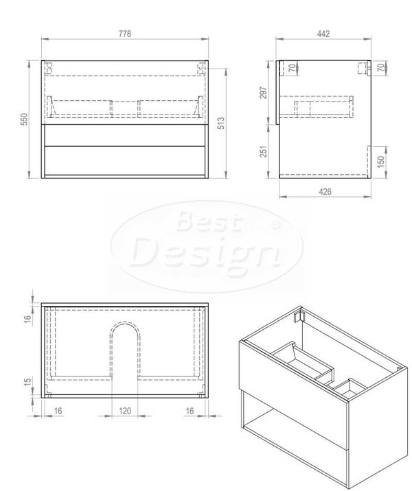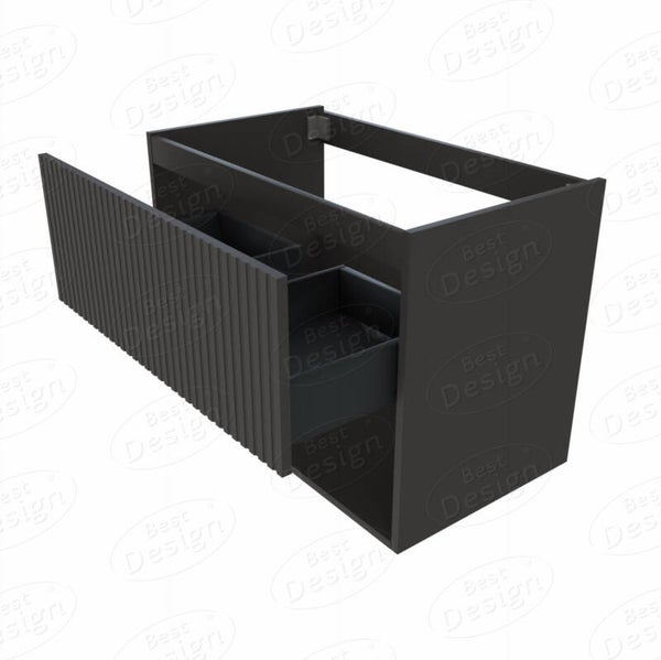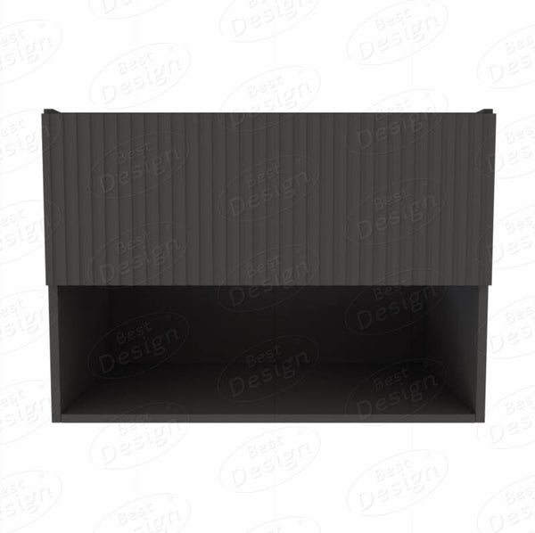 Met een breedte van 77,8 cm, een diepte van 44,2 cm en een hoogte van 55 cm biedt het voldoende opbergruimte met één lade en een softclose-mechanisme voor zacht sluiten. De binnenkant van de lade is zwart, wat een uniforme uitstraling geeft. Onder de lade bevindt zich een open schap, waar ruimte is voor het opbergen van bijvoorbeeld handdoeken. Het opvallende kenmerk is de geribbelde frontlade, wat een uniek textuuraccent toevoegt aan dit aantrekkelijke meubelstuk.