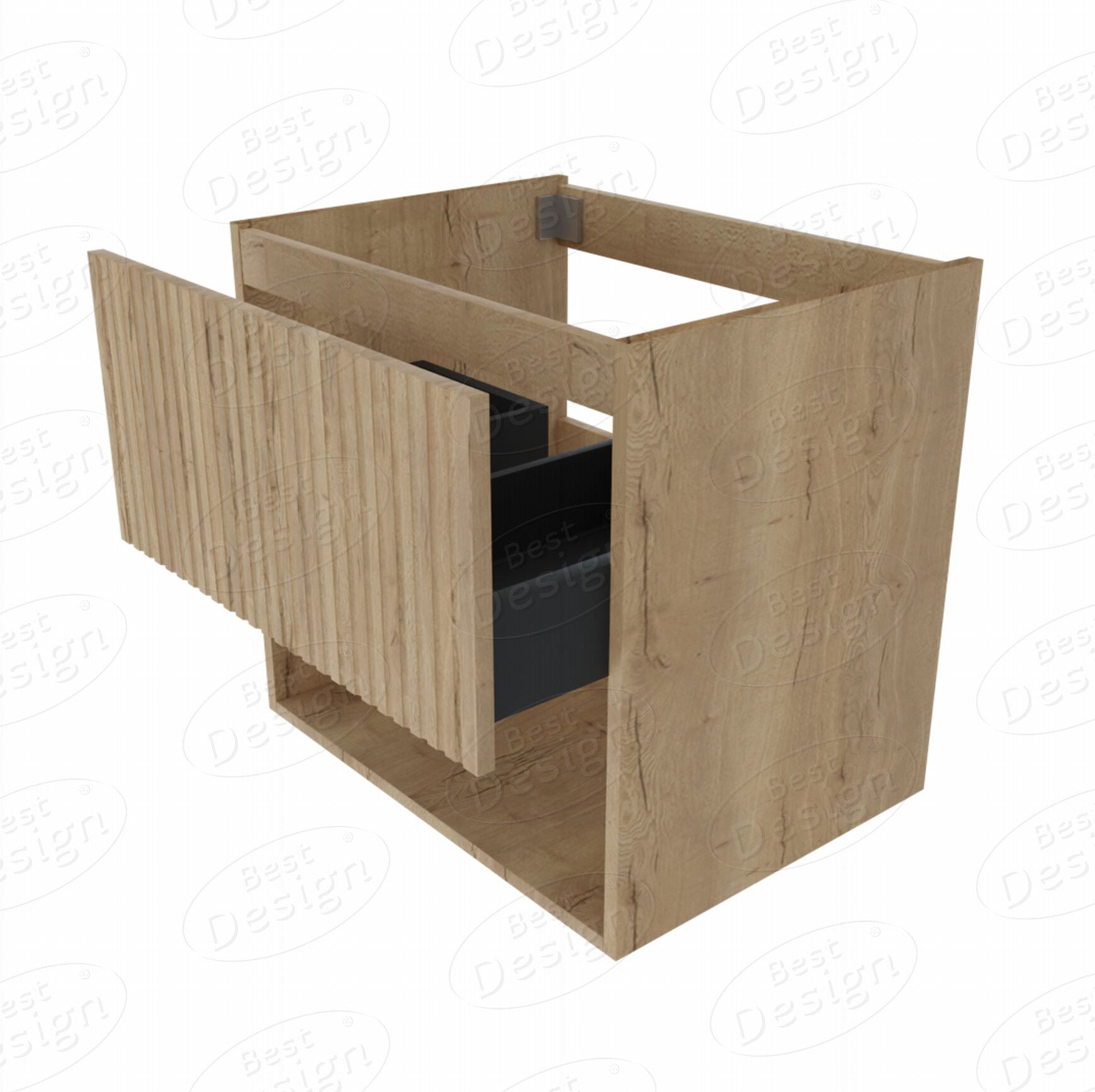 Met een breedte van 59,6 cm, een diepte van 44,2 cm en een hoogte van 55 cm biedt het voldoende opbergruimte met één lade en een softclose-mechanisme voor zacht sluiten. De binnenkant van de lade is zwart, wat een uniforme uitstraling geeft. Onder de lade bevindt zich een open schap, waar ruimte is voor het opbergen van bijvoorbeeld handdoeken. Het opvallende kenmerk is de geribbelde frontlade, wat een uniek textuuraccent toevoegt aan dit aantrekkelijke meubelstuk.