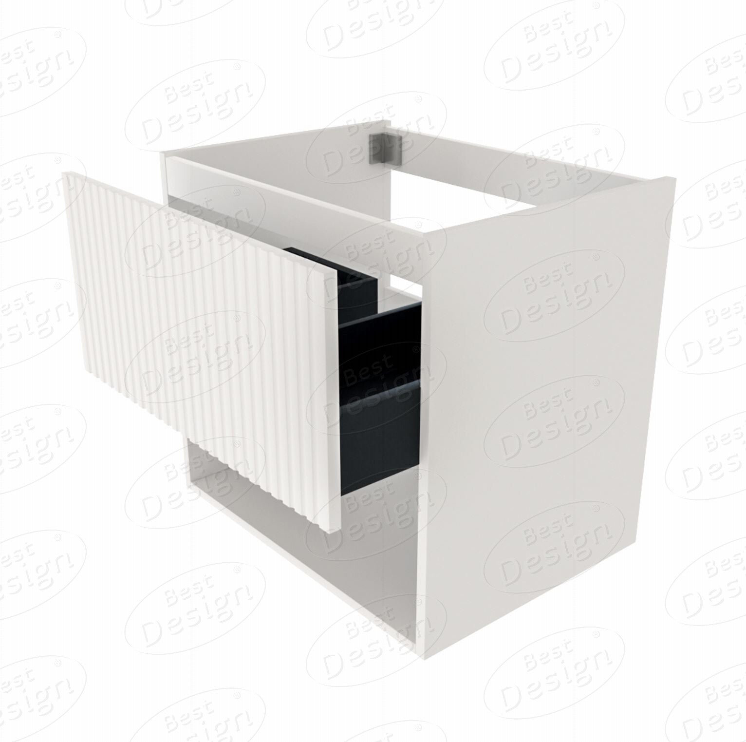 Met een breedte van 59,6 cm, een diepte van 44,2 cm en een hoogte van 55 cm biedt het voldoende opbergruimte met één lade en een softclose-mechanisme voor zacht sluiten. De binnenkant van de lade is zwart, wat een uniforme uitstraling geeft. Onder de lade bevindt zich een open schap, waar ruimte is voor het opbergen van bijvoorbeeld handdoeken. Het opvallende kenmerk is de geribbelde frontlade, wat een uniek textuuraccent toevoegt aan dit aantrekkelijke meubelstuk.