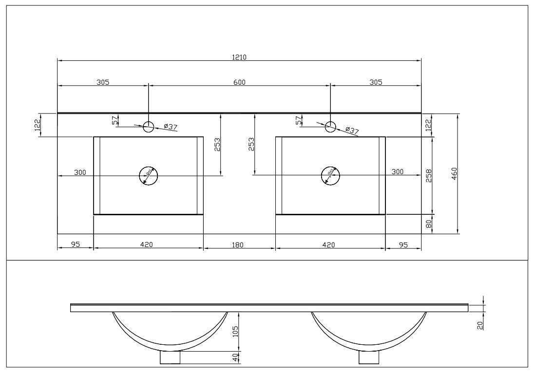 Een Keramische dubbele wastafel 120x46 met 2 kraangaten en 2 afvoeren. Afgewerkt in een glans witte kleur.