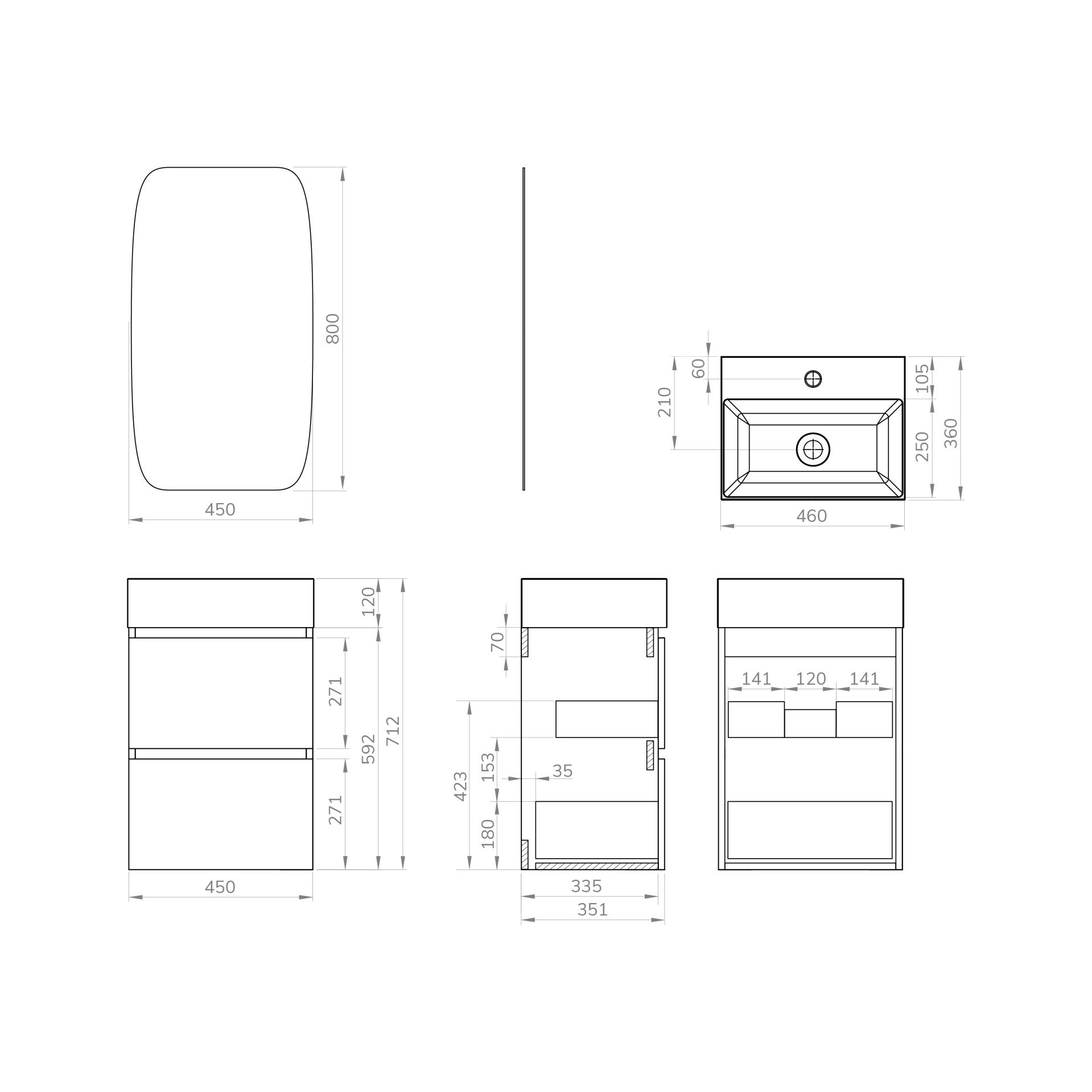 Xellanz "Mini" onderkast met 2 laden 45 cm Mat-zwart en wastafel keramiek Glans-wit inclusief spiegel