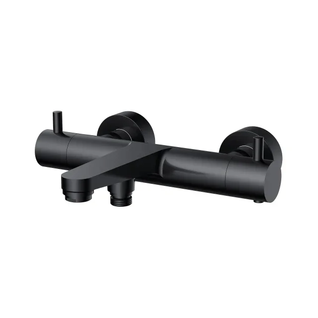 De badthermostaat uit de serie Skive combineert functionaliteit met een opvallend matzwart ontwerp. De kraan beschikt over een thermostaat wat betekent dat de watertemperatuur constant gehouden wordt en een temperatuurbegrenzing heeft om ongewenst hete temperaturen te voorkomen. Met de aan/uit draaiknop kan de waterstroom ingesteld worden. Naast dat er water uit de uitloop kan komen, is deze badthermostaat ook geschikt om een doucheslang met handdouche er op vast te monteren. Met behulp van de omstelknop aan de bovenzijde kan hiertussen gewisseld worden. Kortom, met deze opbouw badthermostaat kun je elke dag een luxueuze badervaring beleven.