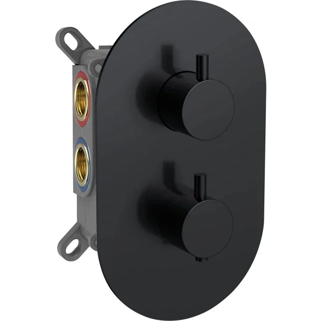 De inbouwthermostaat “skive" is een stijlvolle toevoeging aan elke badkamer. Met de twee knoppen is de thermostaat eenvoudig te bedienen. De thermostaat beschikt over een temperatuurbegrenzing tot 38 graden. Hierdoor kan de kraan niet zomaar warmer gezet worden. De inbouwthermostaat wordt geleverd met het inbouw en opbouwdeel, helemaal compleet dus! Het fijne aan deze inbouwthermostaat is dat als er zich een probleem voordoet, niet de gehele thermostaat uit de muur gehaald hoeft te worden. Vanaf de voorzijde kan gemakkelijk bij de filters, keerkleppen en binnenwerken gekomen worden. De Mat-zwarte kleur van inbouwthermostaat voegt een vleugje elegantie toe aan de badkamer.