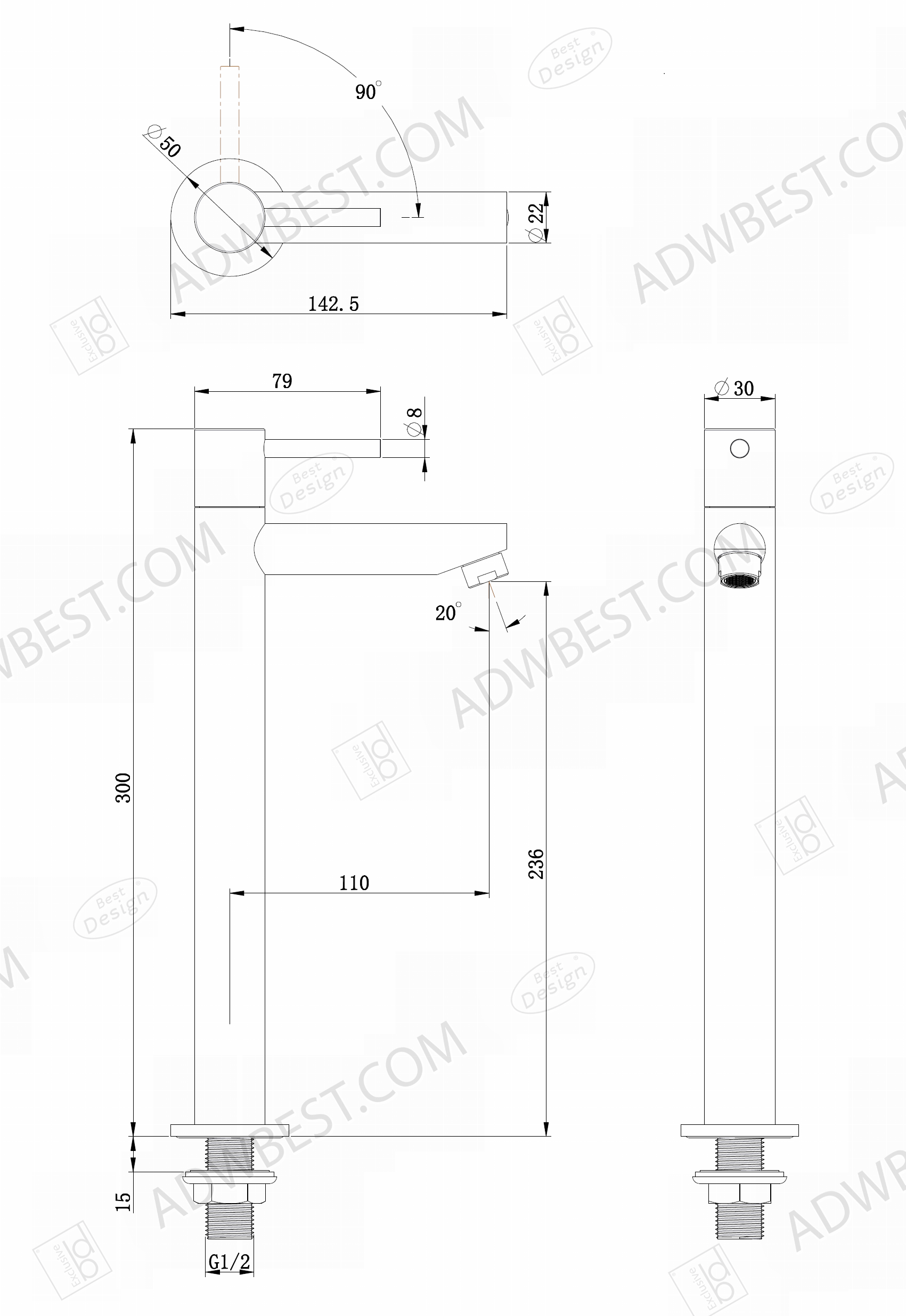 De rvs “High-Aquador” toiletkraan in rvs is een modern en stijlvol product dat perfect is voor fonteinen. Met een buitendraad aansluiting van 1/2″ en een diepte van 142,5 mm is deze kraan eenvoudig te installeren en zorgt hij voor een elegante uitstraling in je toilet. De lengte van de uitloop is 110 mm, wat voldoende ruimte biedt voor comfortabel gebruik. Met een totale hoogte van 300 mm en een staande montagewijze is de Rvs “High-Aquador” toiletkraan een uitstekende keuze voor wie op zoek is naar een hoogwaardige, functionele en esthetisch aantrekkelijke kraan voor het toilet. Combineer de High-Aquador samen met de Malo planchet & de Arezzo fontein opbouwkom.