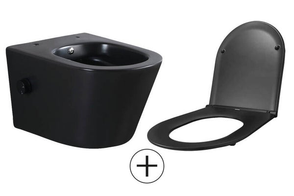 Wiesbaden "Vesta" wandcloset rimless met bidetkraan koud water met Flatline toiletzitting Mat-zwart
