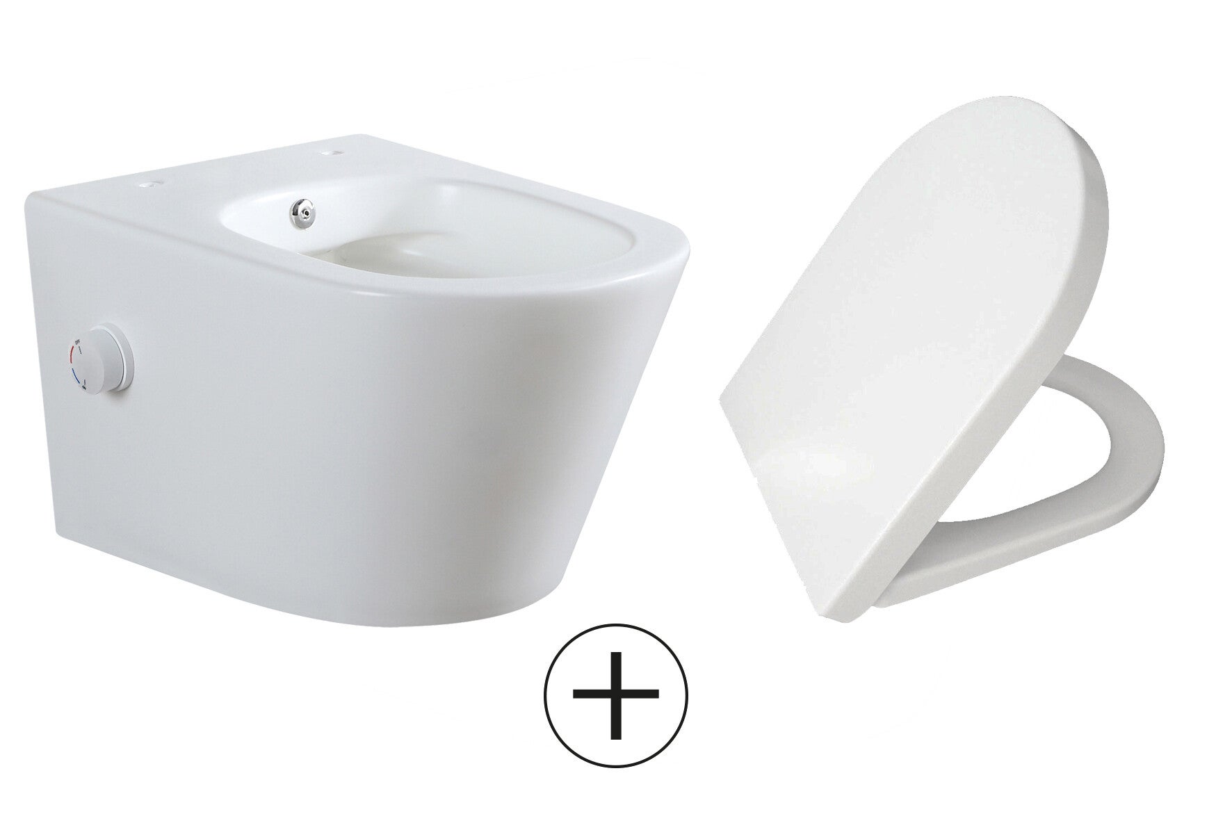 Wiesbaden "Vesta" wandcloset rimless met bidetkraan warm/koud water met Vesta toiletzitting Mat-wit