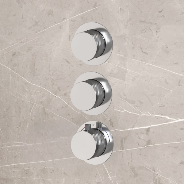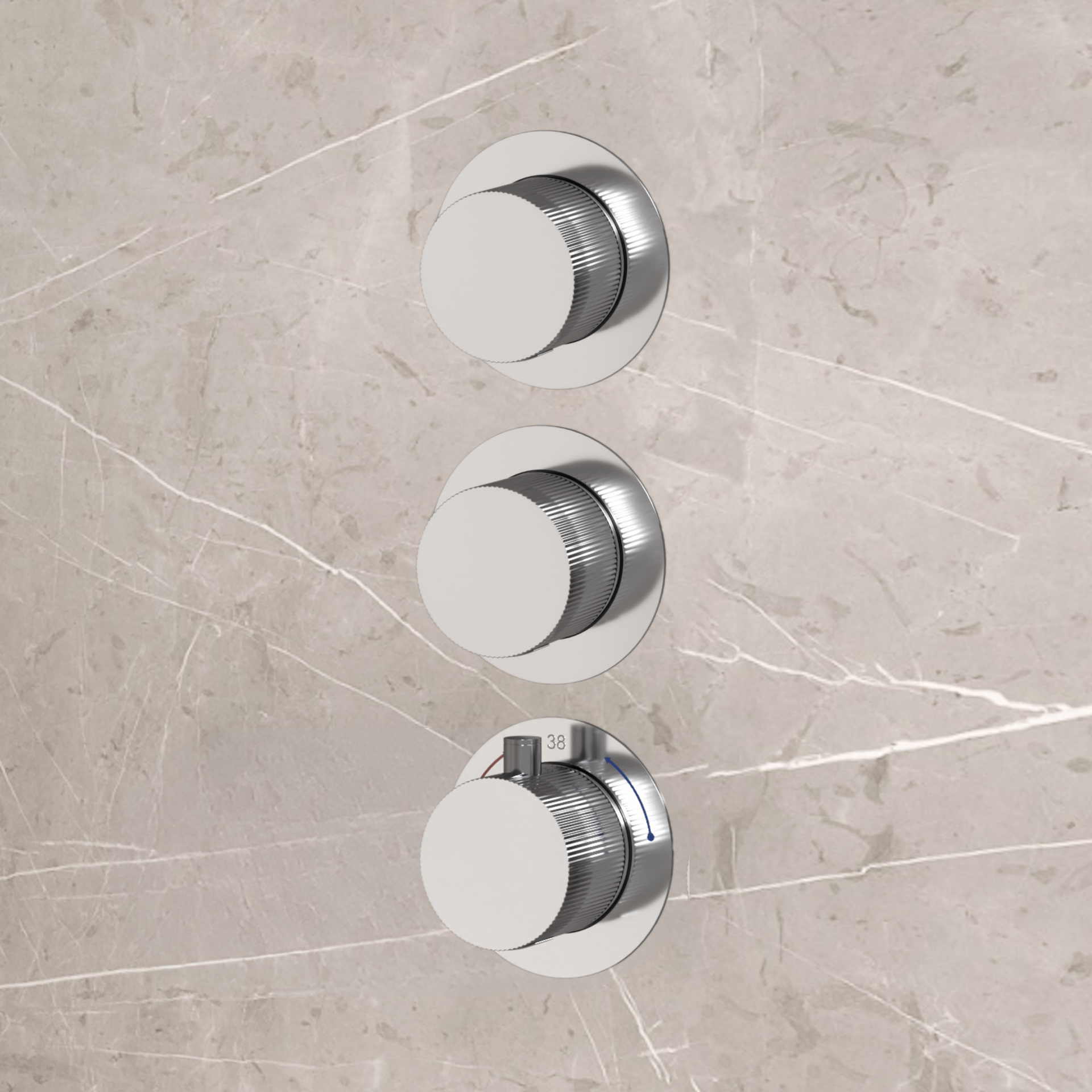 De "High-End Chrome" inbouwthermostaat biedt met twee bedieningselementen de mogelijkheid om eenvoudig te schakelen tussen verschillende functies, zoals een handdouche en hoofddouche. De derde knop is specifiek ontworpen voor het nauwkeurig regelen van de temperatuur, wat zorgt voor optimaal comfort.