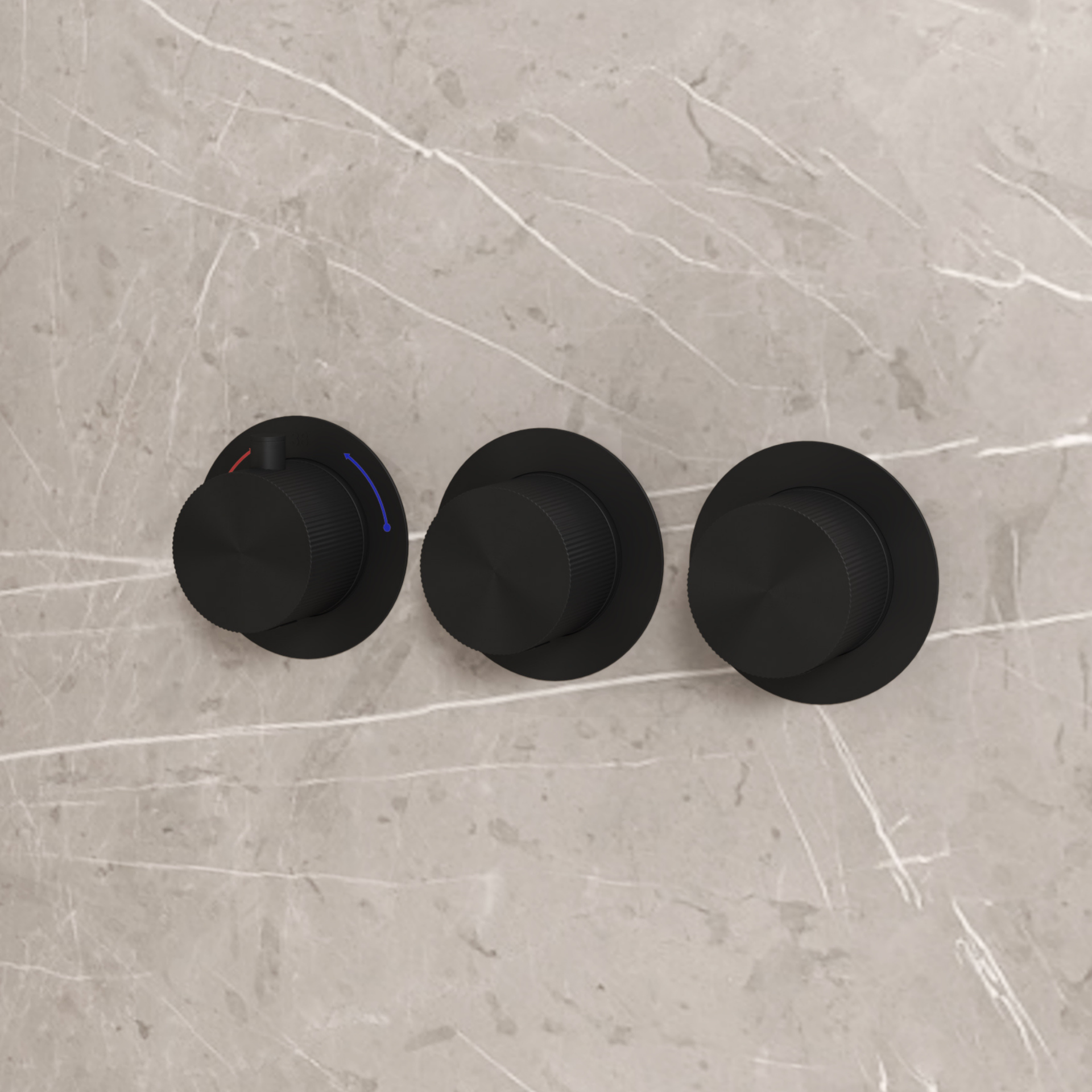 De "High-End Nero" inbouwthermostaat biedt met twee bedieningselementen de mogelijkheid om eenvoudig te schakelen tussen verschillende functies, zoals een handdouche en hoofddouche. De derde knop is speciaal ontworpen voor het nauwkeurig regelen van de temperatuur, wat zorgt voor optimaal comfort.
