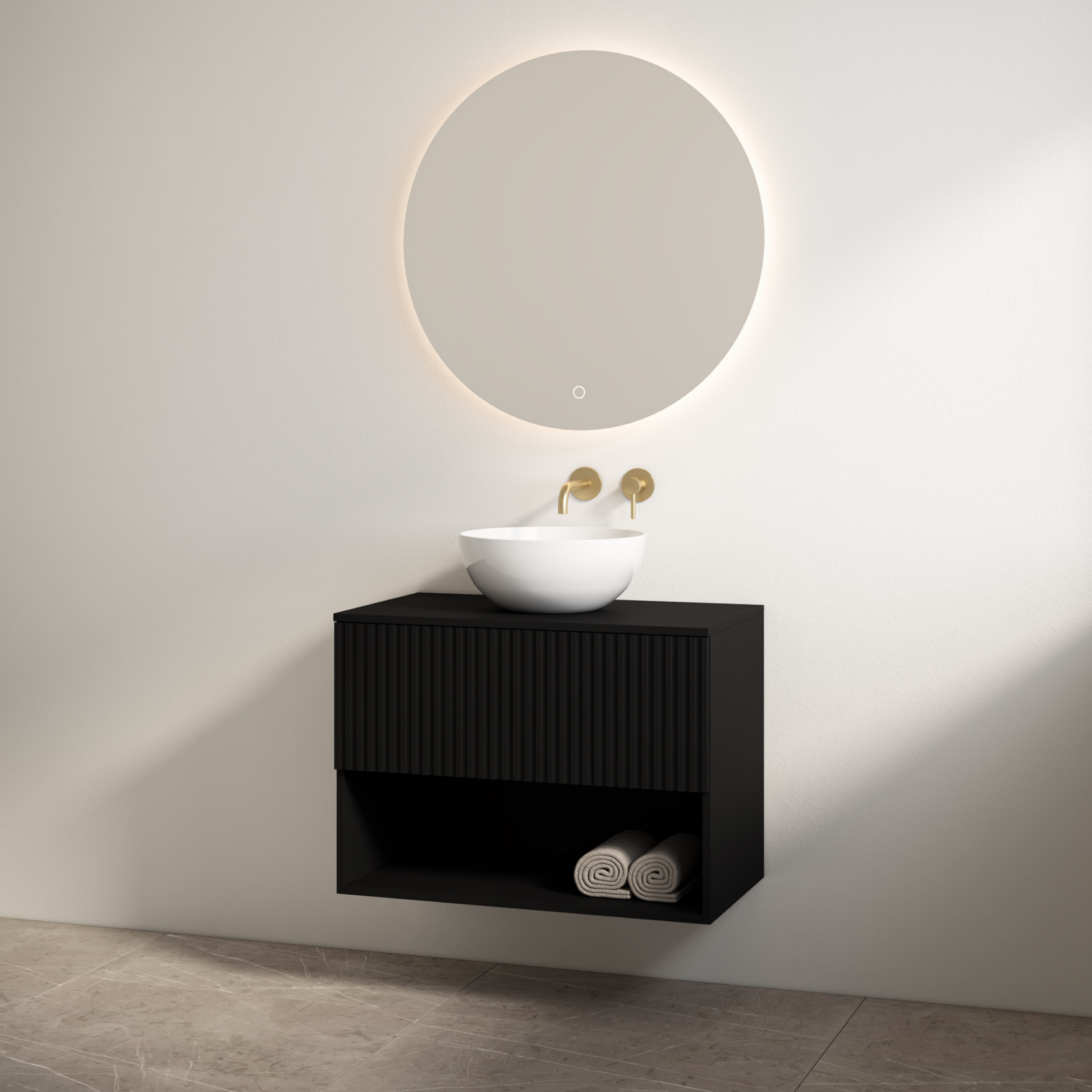 Een badkamermeubel moet niet alleen mooi zijn, maar ook slim ingedeeld. De Rigatti-60 biedt een moderne, luxe uitstraling met een mat-zwarte onderkast en een bijpassend mat-zwart meubelblad. De softclose-lade zorgt voor nette opbergruimte, terwijl het open schap ideaal is voor handdoeken of stijlvolle accessoires. Het meubelblad heeft geen voorgeboord kraangat of afvoergat, waardoor de ideale opstelling naar wens kan worden bepaald. Voor een staande wastafelkraan kan eenvoudig een kraangat worden gemaakt. Bij een inbouw-wandmengkraan blijft het blad ongewijzigd.