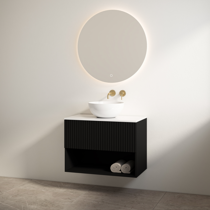 Een badkamermeubel moet niet alleen mooi zijn, maar ook slim ingedeeld. De Rigatti-60 biedt een moderne, luxe uitstraling met een mat-zwarte onderkast en een mat-wit meubelblad. De softclose-lade zorgt voor nette opbergruimte, terwijl het open schap ideaal is voor handdoeken of stijlvolle accessoires. Het meubelblad heeft geen voorgeboord kraangat of afvoergat, waardoor de ideale opstelling naar wens kan worden bepaald. Voor een staande wastafelkraan kan eenvoudig een kraangat worden gemaakt. Bij een inbouw-wandmengkraan blijft het blad ongewijzigd.