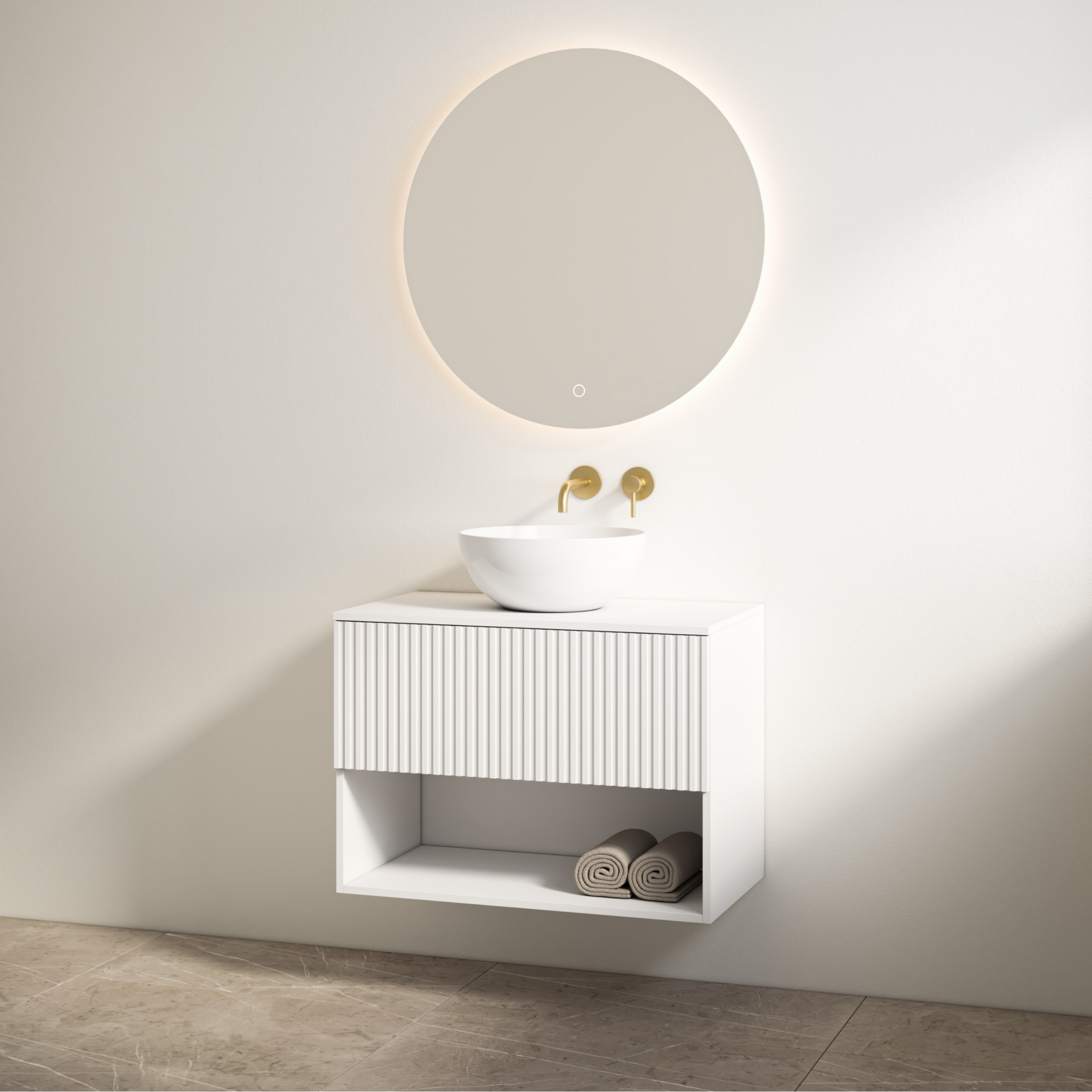 Een badkamermeubel moet niet alleen mooi zijn, maar ook slim ingedeeld. De Rigatti-60 biedt een moderne, luxe uitstraling met een mat-witte onderkast en een bijpassend mat-wit meubelblad. De softclose-lade zorgt voor nette opbergruimte, terwijl het open schap ideaal is voor handdoeken of stijlvolle accessoires. Het meubelblad heeft geen voorgeboord kraangat of afvoergat, waardoor de ideale opstelling naar wens kan worden bepaald. Voor een staande wastafelkraan kan eenvoudig een kraangat worden gemaakt. Bij een inbouw-wandmengkraan blijft het blad ongewijzigd.