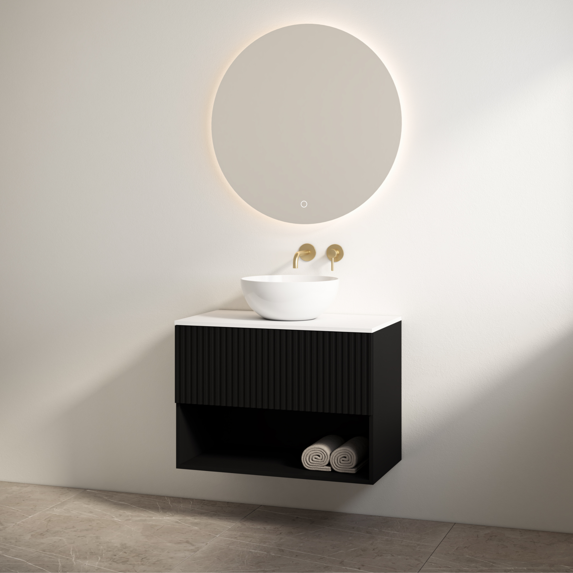 Een badkamermeubel moet niet alleen mooi zijn, maar ook slim ingedeeld. De Rigatti-78 biedt een moderne, luxe uitstraling met een mat-zwarte onderkast en een mat-wit meubelblad. De softclose-lade zorgt voor nette opbergruimte, terwijl het open schap ideaal is voor handdoeken of stijlvolle accessoires. Het meubelblad heeft geen voorgeboord kraangat of afvoergat, waardoor de ideale opstelling naar wens kan worden bepaald. Voor een staande wastafelkraan kan eenvoudig een kraangat worden gemaakt. Bij een inbouw-wandmengkraan blijft het blad ongewijzigd.