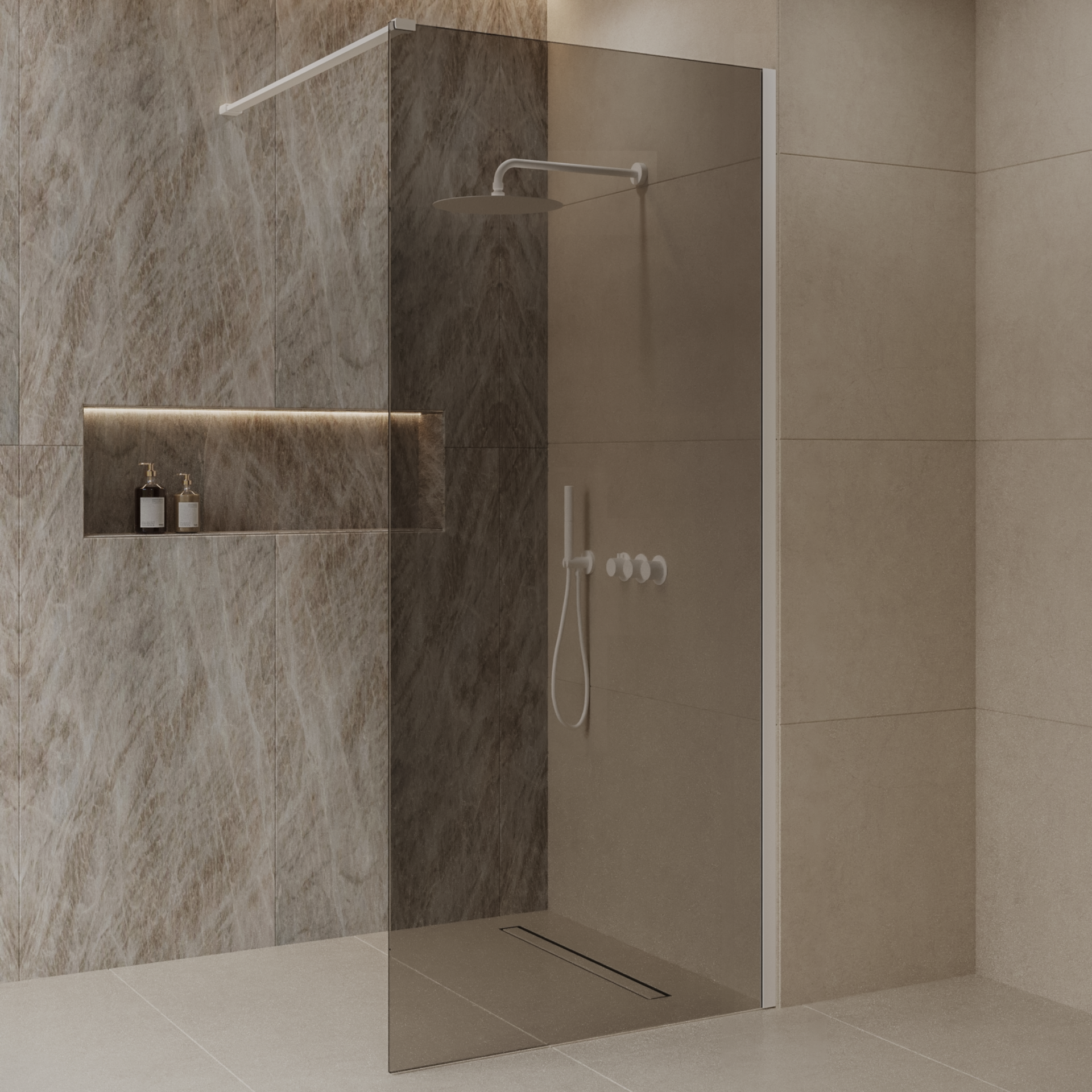 Geef je badkamer een upgrade met de stijlvolle "Dalis" inloopdouche met Mocha-glas. Deze luxe glaskleur – een warme mix van grijs en brons – brengt direct een elegante, moderne sfeer in je badkamer. De mat-witte profielen geven de douche een frisse, verfijnde uitstraling en vormen een prachtig contrast met het Mocha-glas, wat zorgt voor een strakke en minimalistische afwerking.
