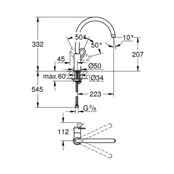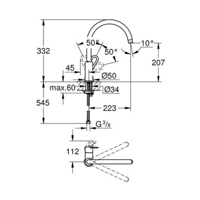 De hoogte van de Bauloop keukenkraan is 33.2 cm en heeft een ronde uitloop.