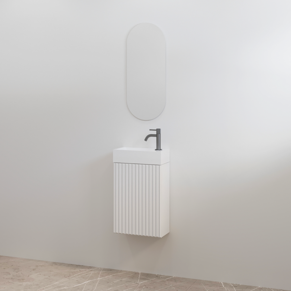 Een toiletmeubel mag dan compact zijn, het mag zeker ook stijl en gemak combineren. Deze toiletmeubelset bestaat uit een strakke mat-witte onderkast met een bijpassend fonteintje, wat zorgt voor een frisse en moderne uitstraling. De deur is voorzien van een subtiel geribbeld front, wat een verfijnd en speels detail toevoegt aan het ontwerp.