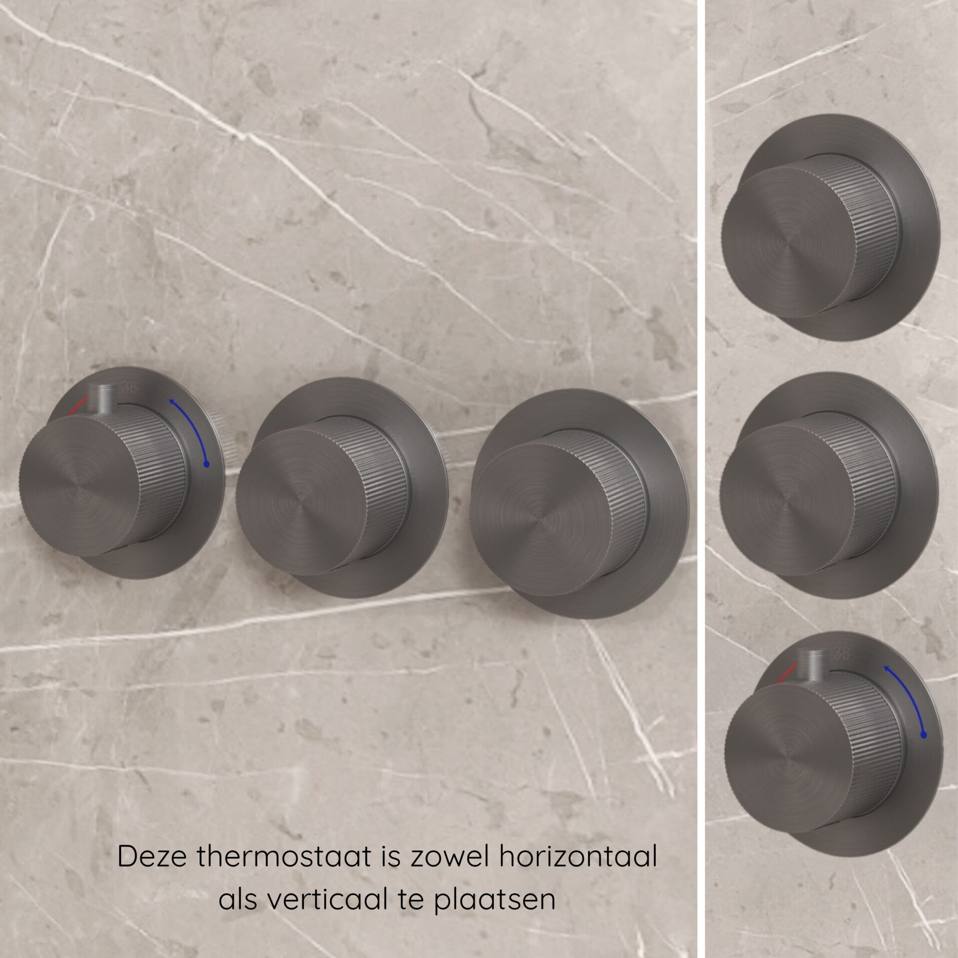 De High-End Moya M-250 inbouw-regendoucheset heeft een karaktervolle uitstraling dankzij de gunmetal afwerking en gemaakt van RVS. Deze kleur brengt een subtiel industriële, maar toch verfijnde sfeer in de badkamer. Zowel de hoofddouche als de bedieningsknoppen van de inbouwthermostaat zijn uitgerust met een elegant geribbeld reliëf.