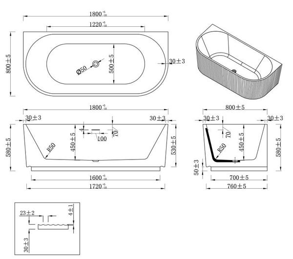 Verkrijgbaar als hoekbad of half vrijstaand bad, zodat het moeiteloos past in elke ruimte. De ribbelstructuur geeft het bad een trendy en originele uitstraling.