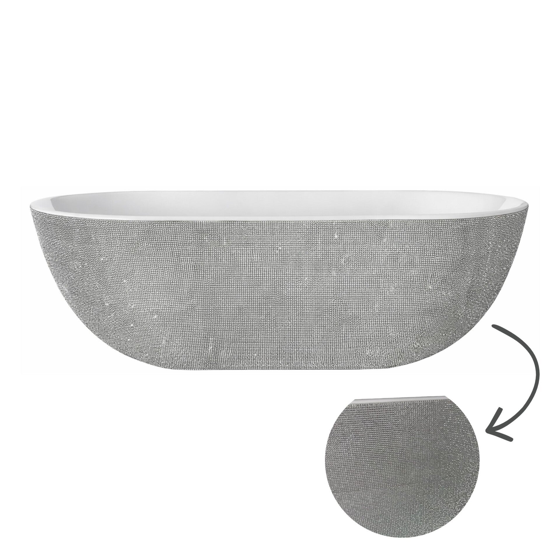 Het vrijstaande Diamond bad combineert een glans-witte binnenzijde met een volledig met steentjes beklede buitenkant. De voelbare structuur zorgt voor een uniek reliëf en een uitgesproken, luxe uitstraling. Een exclusief designbad voor wie geen standaard badkamer wil, maar een echte eyecatcher.