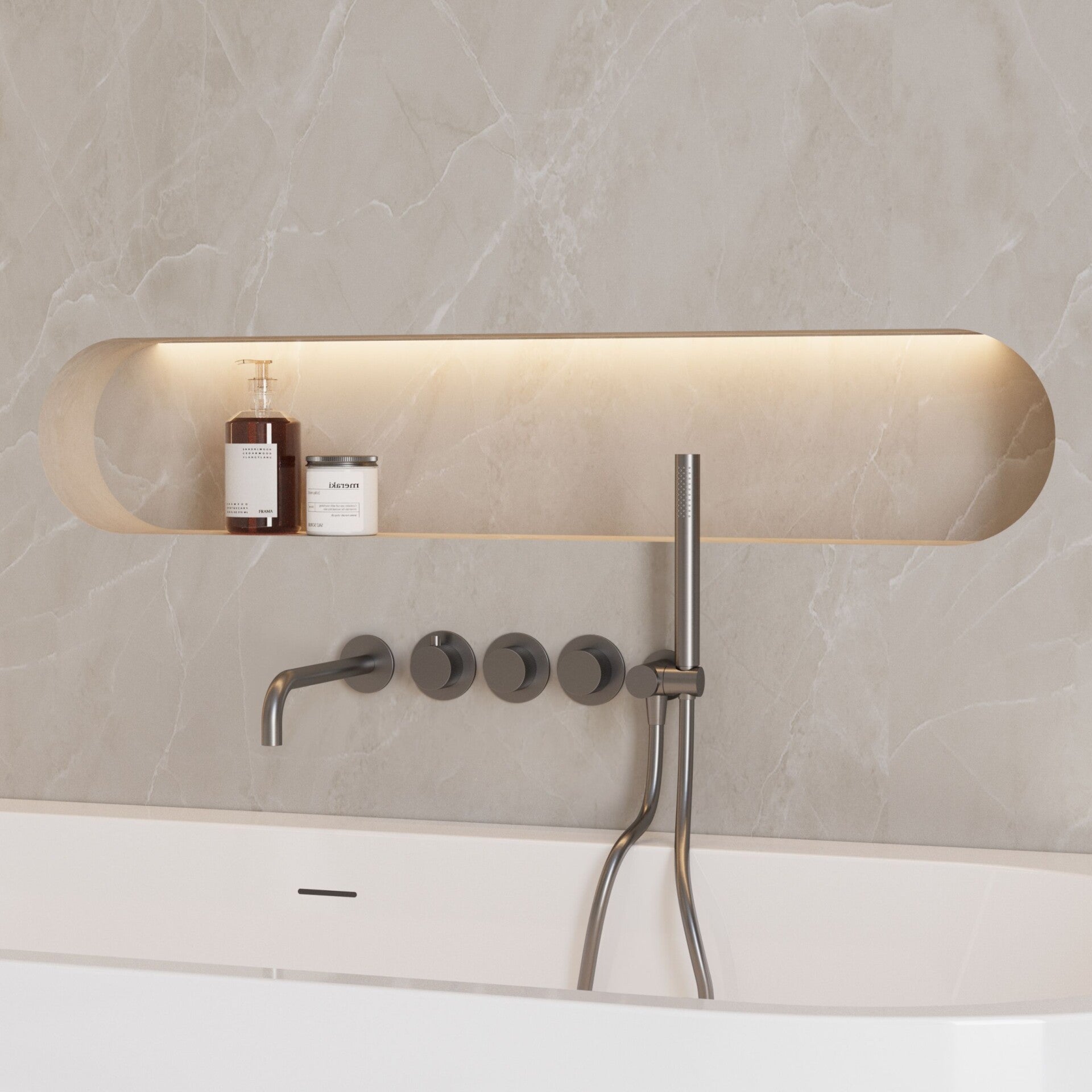 De High-End Moya thermostatische inbouw badkraan is een luxueuze inbouwoplossing voor wie een stijlvolle en moderne badkamer wil creëren. Vervaardigd uit RVS en uitgevoerd in gunmetal, straalt deze badkraan een stoere en verfijnde elegantie uit. De bedieningsknoppen zijn voorzien van een subtiel geribbeld reliëf, wat zorgt voor een karaktervol detail.