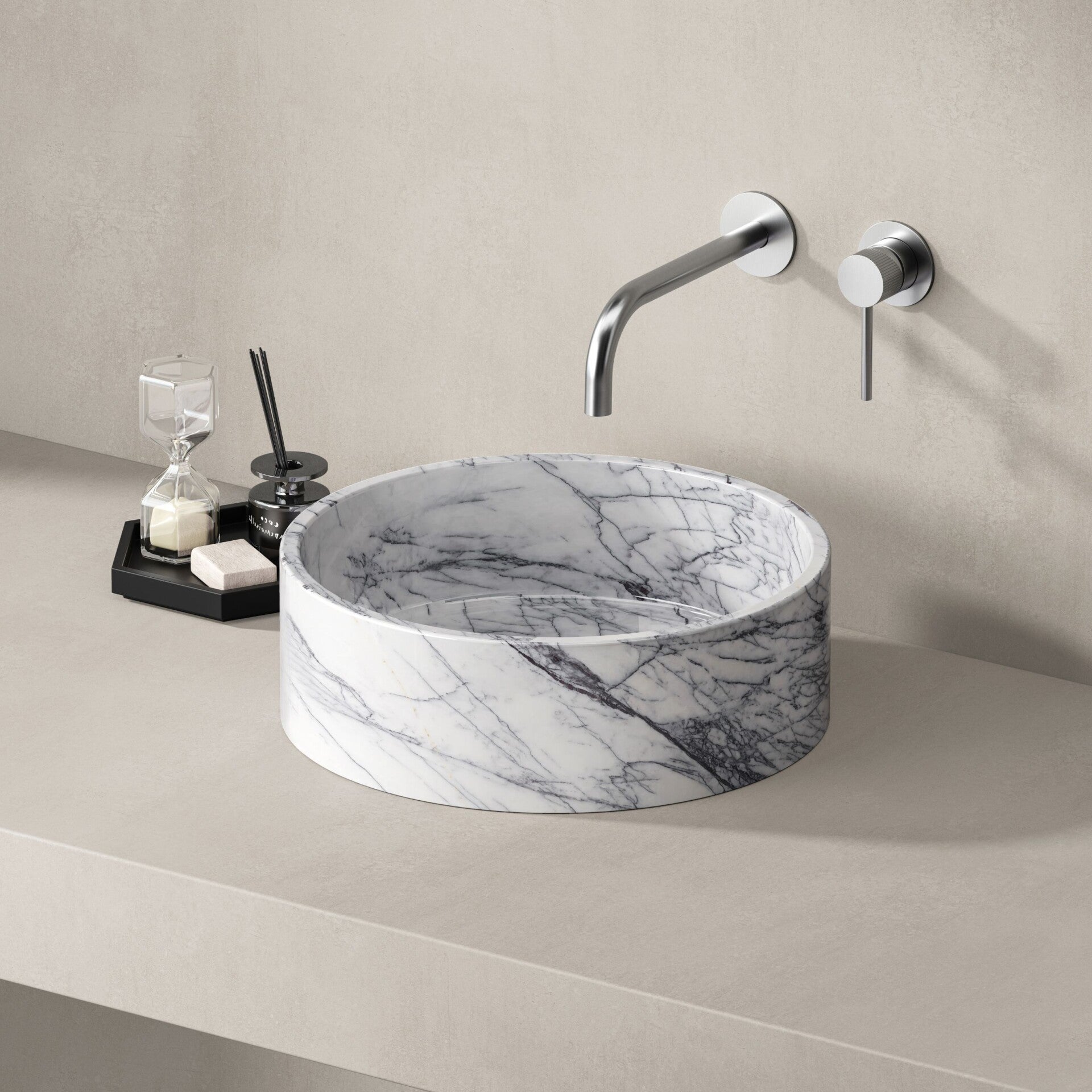 De Pureline waskom in Lilac Marble is gemaakt van marmer en straalt luxe en natuurlijke elegantie uit. Met een diameter van 40 cm en een hoogte van 13 cm is deze waskom ideaal voor een stijlvol badkamerinterieur. Het marmer kenmerkt zich door een verfijnde, natuurlijke adering in grijze en subtiel paarsgrijze tinten, waardoor iedere waskom uniek is. De lichte marmerkleur geeft de waskom een tijdloze en stijlvolle uitstraling.