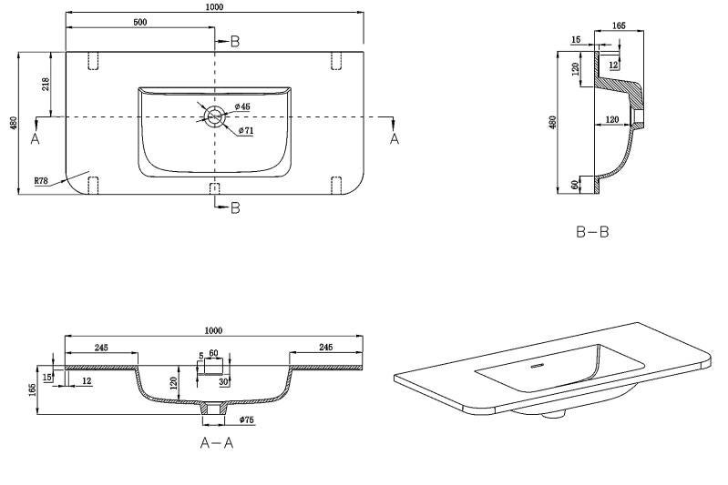 Wiesbaden "Laro wastafel zonder kraangat ronde hoeken 100 x 48 x 1,5 cm solid surface Mat-wit
