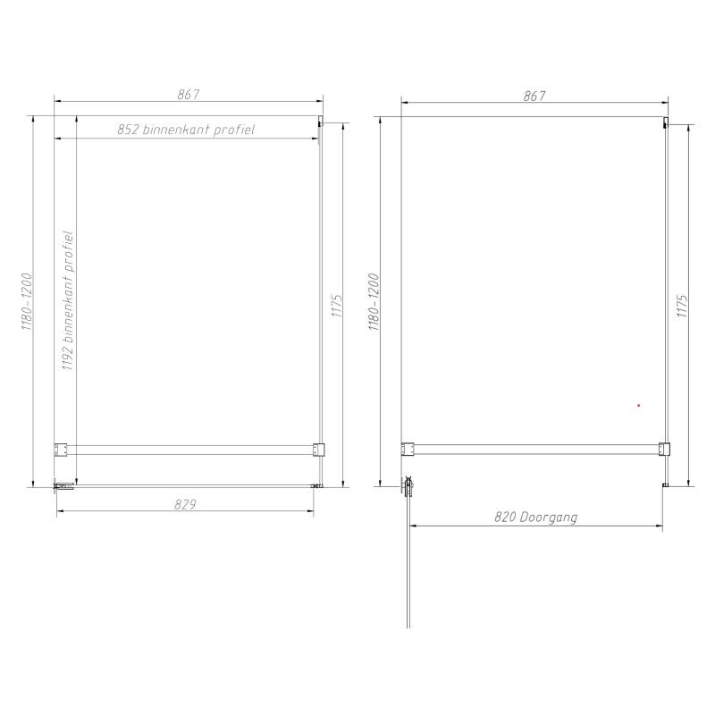 De profielen, scharnieren, stabilisatiestangen en greep zijn uitgevoerd in een mat-zwarte afwerking en het benodigde bevestigingsmateriaal wordt standaard meegeleverd. De cabine heeft een hoogte van 2000 mm. Voor de exacte maatvoering en plaatsingsinformatie wordt verwezen naar de technische tekening.
