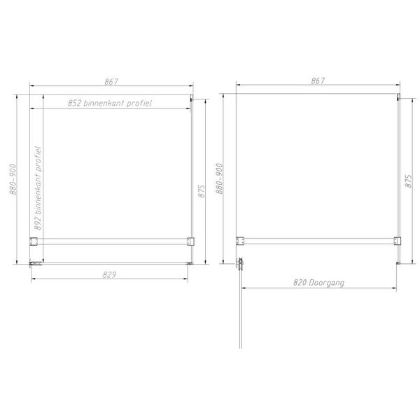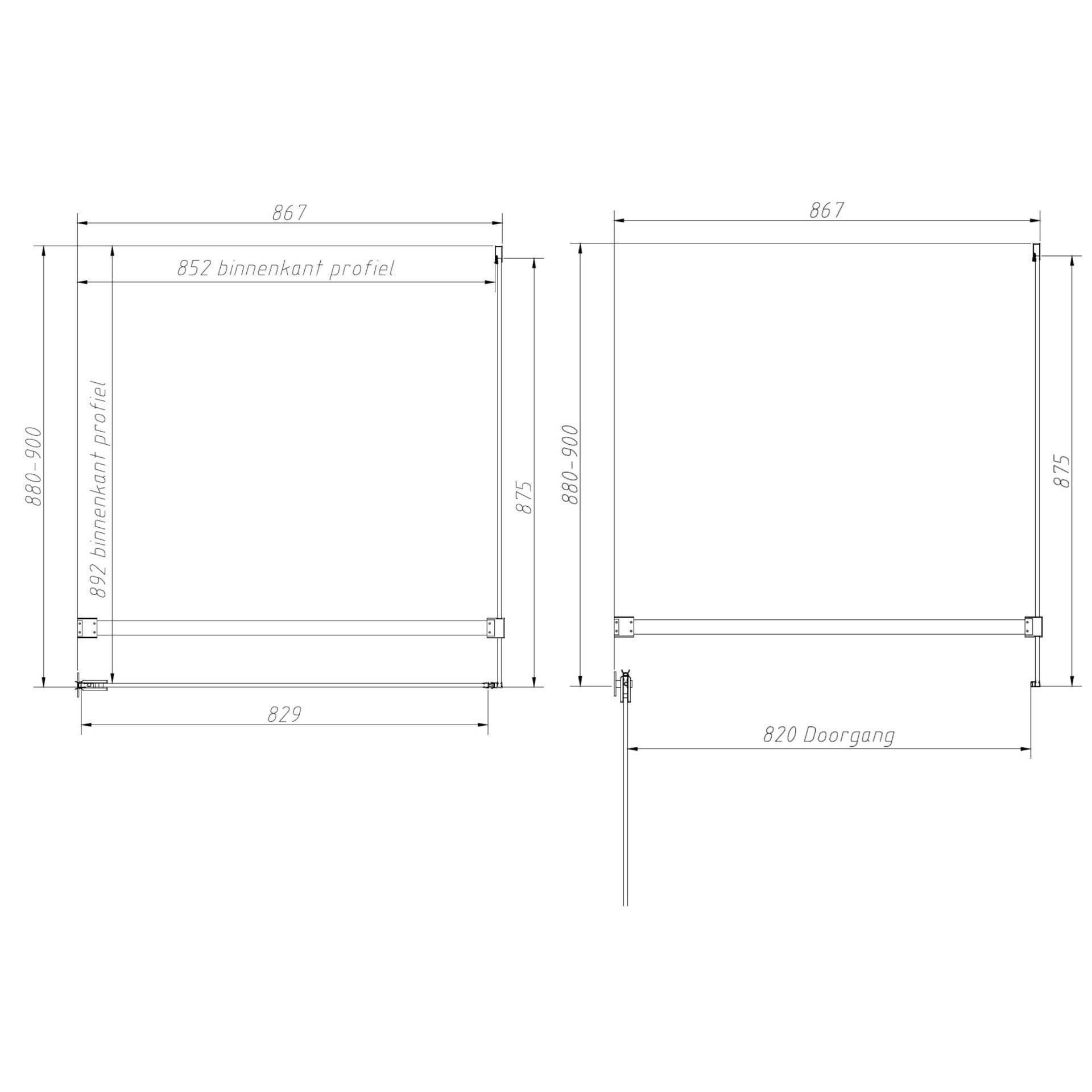 De profielen, scharnieren, stabilisatiestangen en greep zijn uitgevoerd in een RVS afwerking en het benodigde bevestigingsmateriaal wordt standaard meegeleverd. De cabine heeft een hoogte van 2000 mm. Voor de exacte maatvoering en plaatsingsinformatie wordt verwezen naar de technische tekening.