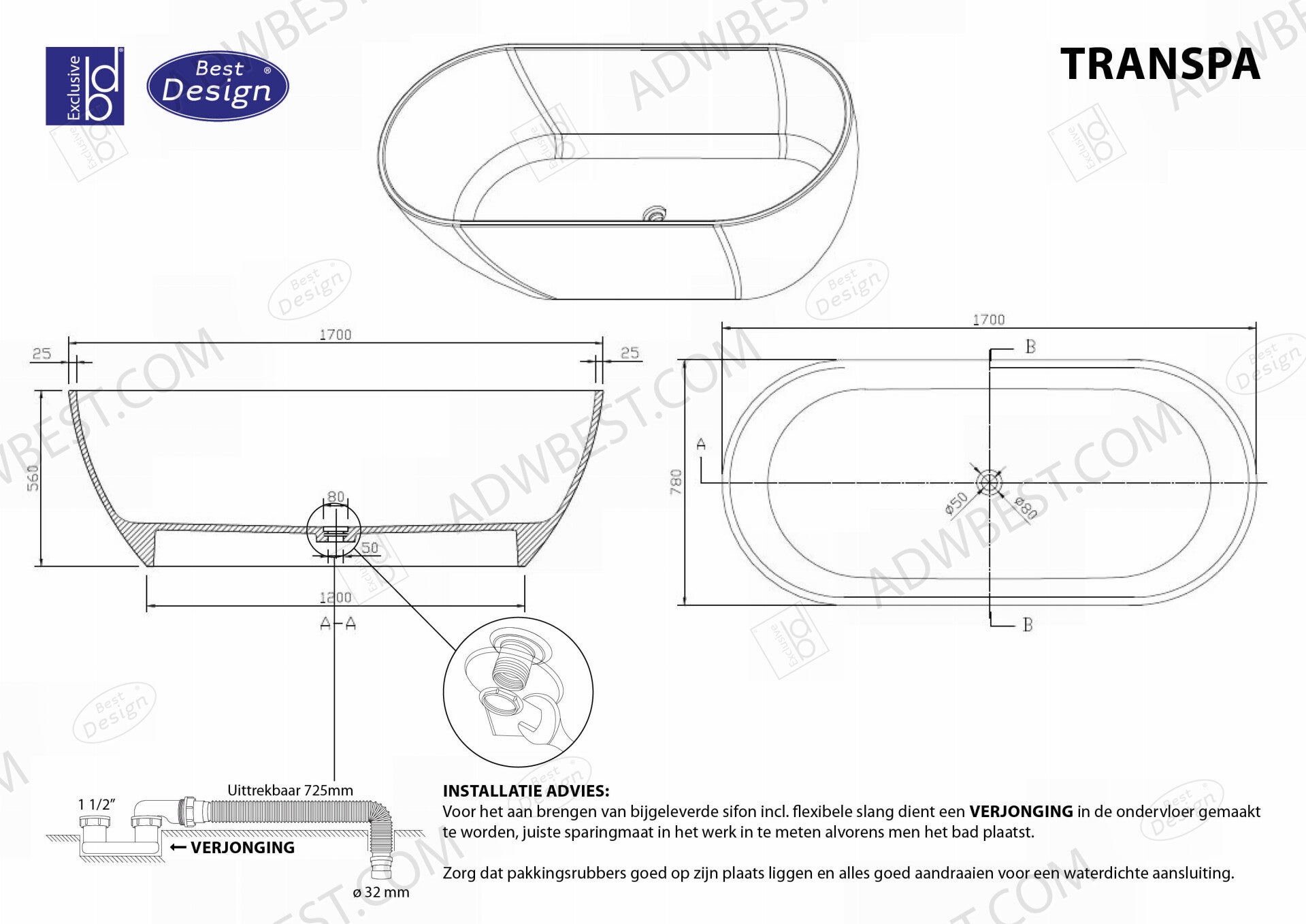 Het Color “Transpa-Blue” vrijstaande bad is een opvallend stuk voor een stijlvolle badkamer. Met een ovaal ontwerp en afmetingen van 170 cm in lengte, 78 cm in breedte en 56 cm in hoogte, biedt dit bad voldoende ruimte om te ontspannen.