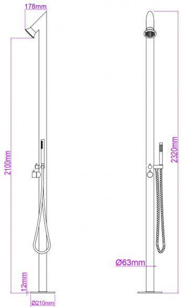 De douche is gemaakt van RVS 316. Dit is het meest hoogwaardige RVS dat er bestaat en dat maakt de tuindouche bestand tegen alle weersomstandigheden. De douche heeft een hoogte van 232 cm.