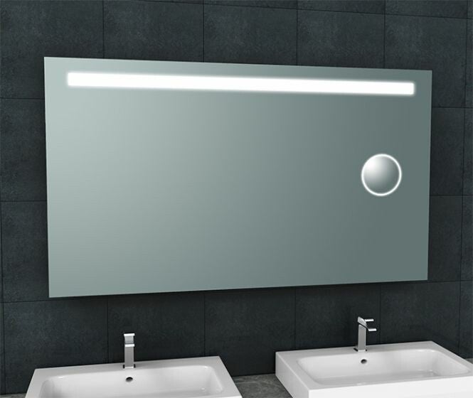 De Tigris spiegel met LED verlichting & scheerspiegel van Wiesbaden Sanitair is door zijn luxe uitstraling een echte aanwinst voor elke moderne badkamer. De Tigris spiegel heeft bovenin de spiegel een geïntegreerde horizontale LED lichtbalk (17,4 Watt) van 6400 Kelvin (daglicht). Deze is door middel van een drukschakelaar aan en/of uit te zetten. Door de geïntegreerde transformator kun je de spiegel direct op het lichtnet (220V) aansluiten. De LED verlichting (energielabel A) heeft een gebruiksduur van ongeveer 50.000 branduren en geeft 1390 lumen.