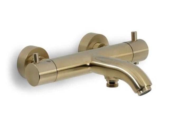 De Schiphorst-Sanitair Brondby is een Badthermostaat die gemaakt is van messing met een keramische binnenwerk en een temperatuur begrenzer de bedieningsknoppen zijn van kunststof. deze kraan is volledig van geborsteld goud, de Badkraan heeft een lange uitloop.