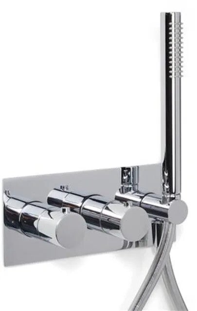 Deze word geleverd met een inbouw thermostaat gemaakt van messing en wordt geleverd met kunststof handdouche en doucheslang.
