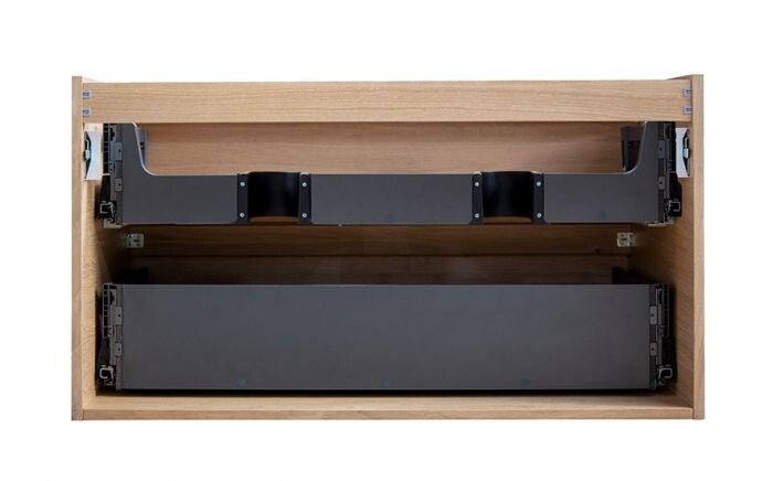 De stijlvolle onderkasten uit de Lotus serie van Wiesbaden Sanitair zijn gemaakt van MDF bedekt met eikenfineer en geven een warme sfeer aan de badkamer. De fineerlaag is gemaakt van echt hout, zo heb je altijd een uniek meubel in de badkamer! Het zwart metalen frame geeft een moderne uitstraling aan de onderkasten. De Lotus onderkasten hebben een voelbare houtstructuur en zijn afgewerkt met een hardwax olie. Dit maakt dat het meubel perfect geschikt is voor gebruik in vochtige ruimtes zoals in de badkamer. De onderkast heeft een horizontale nerfrichting. Deze onderkast is 100 bij 45,2 cm en heeft 2 lades met veel opbergruimte. De metalen lades zijn volledig uitschuifbaar en sluiten geruisloos door de hoogwaardige, Europese Grass softclose ladegeleiders. De sifonuitsparing bevindt zich in de bovenste lades waardoor de beschikbare ruimte optimaal benut wordt. Voor extra bergruimte kan de onderkast gecombineerd worden met de Lotus kolomkast (38.3933). Maak de kast compleet en combineer deze met een van onze Raw hardstenen of Vision kunstmarmeren wastafels. De onderkast kan ook gecombineerd worden met een topblad en één van onze waskommen. Het maximale draagvermogen is 400 kg. De onderkast is volledig voorgemonteerd en kan dus meteen geplaatst worden!
