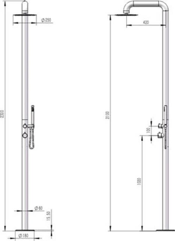De douche is gemaakt van RVS 316. Dit is het meest hoogwaardige RVS dat er bestaat en dat maakt de tuindouche bestand tegen alle weersomstandigheden. De douche heeft een hoogte van 230 cm.