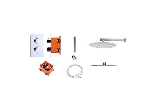 Deze one-pack inbouw-regendoucheset “Verona-M-200” bevat alles wat je nodig hebt voor een luxueuze douche-ervaring. De set bestaat uit de Inbouwthermostaat art. nr. 4004680, Opsteekmuuraansluiting art nr. 3860830, Handdouche art. nr. 3871114, Doucheslang art. nr. 3801110, Muurbeugel art. nr. 3871124 en de Regendouche art. nr. 3801292. Met de inbouwinstallatie krijgt je badkamer een strakke en elegante look. Kies jij voor de verfrissende regendouche of gebruik je de handdouche voor ultiem comfort?