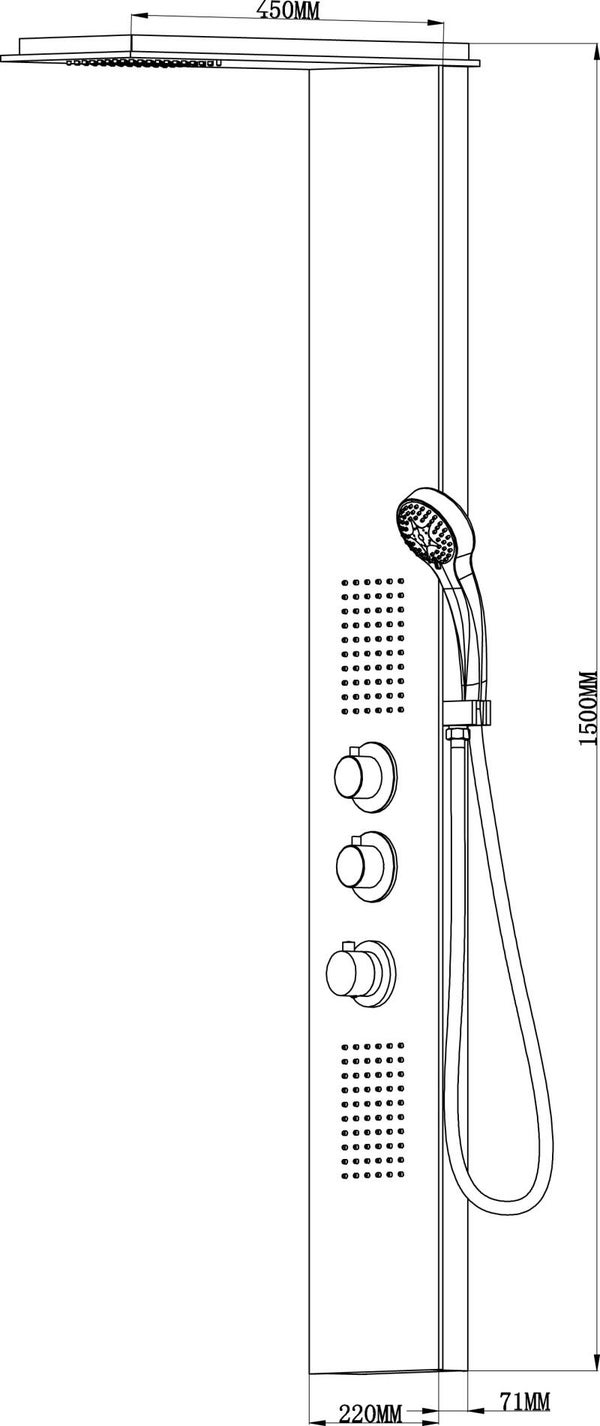De Xellanz "Ontario" thermostatische douchekolom 150x22 cm RVS heeft een Aluminium uitstraling, met zijn 3 ronde knoppen en is voorzien van een hoofddouche, handdouche met 150cm doucheslang, en 2 massagedouches die in het paneel zitten, heeft dit paneel heel veel te bieden. hij is uitgerust met een keramische binnenwerk en heeft een warmtebegrezer. Dit douchepaneel produceert maar liefst 12 liter water per minuut.