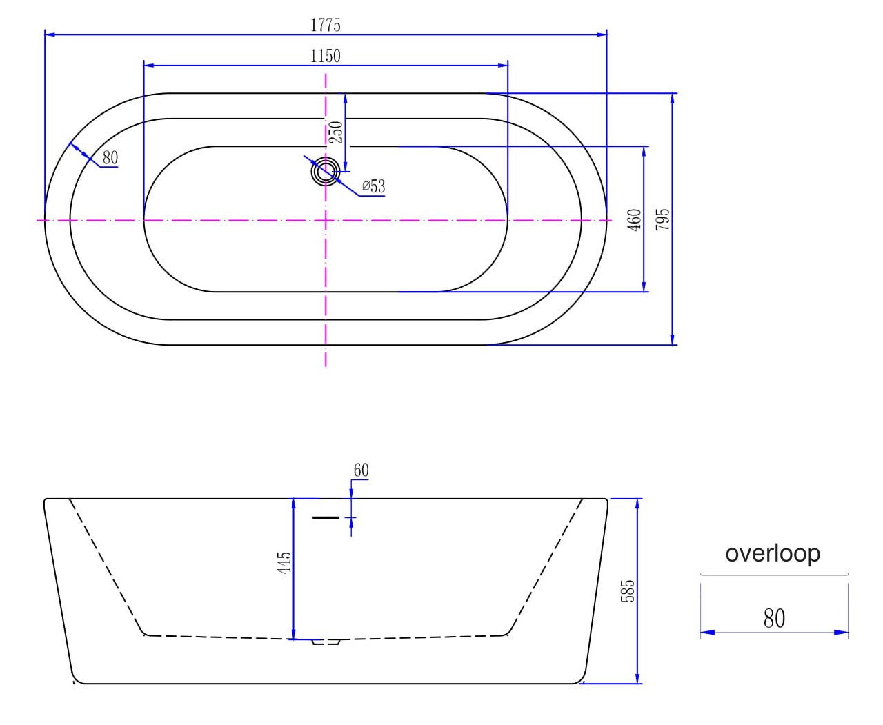 Een ligbad in de badkamer is een genot. Een vrijstaand bad is pure luxe. Met genoeg ruimte wordt een vrijstaand bad een echt statement in de badkamer. Maar ook in een wat kleinere badkamer kan een vrijstaand bad erg mooi staan. bevat een overloop en heeft een afvoergat met een diameter van 53 mm. In de lijntekening vind je de afmetingen van de overloop. Het bad wordt geleverd inclusief witte clickwaste, sifon en een potenset.