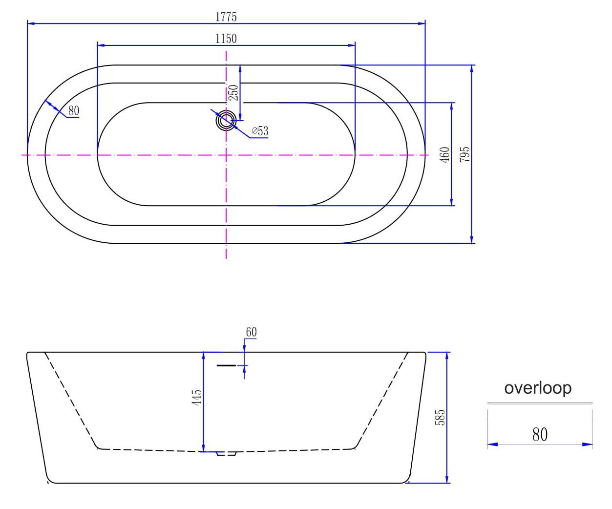 Een ligbad in de badkamer is een genot. Een vrijstaand bad is pure luxe. Met genoeg ruimte wordt een vrijstaand bad een echt statement in de badkamer. Maar ook in een wat kleinere badkamer kan een vrijstaand bad erg mooi staan. bevat een overloop en heeft een afvoergat met een diameter van 53 mm. In de lijntekening vind je de afmetingen van de overloop. Het bad wordt geleverd inclusief witte clickwaste, sifon en een potenset.