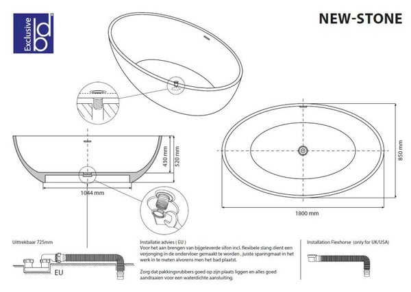 Het “New-Stone” vrijstaande bad in de afmetingen 180x85x52cm is een elegant en luxueus bad. Gemaakt van duurzaam solid-surface materiaal, biedt het naadloze design een moderne uitstraling. Met een mat-witte kleur past het perfect in diverse badkamerstijlen. De overloop en afvoerplug (clic-waste) zijn al gemonteerd, waardoor installatie eenvoudig is. Het ovale ontwerp en de strakke randdikte van 3 cm dragen bij aan de esthetiek van het bad. De meegeleverde sifon zorgt voor een probleemloze waterafvoer. De afvoer bevindt zich in het midden van het bad.
